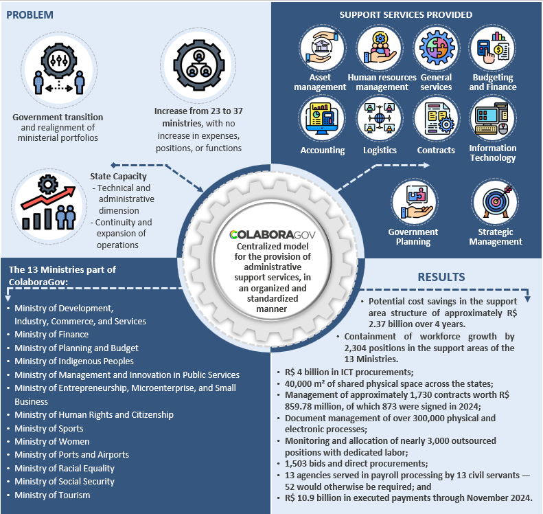 In order to enable strategic ministerial expansion without increasing costs, ColaboraGov centralizes the sharing of administrative support services among 13 ministries. It ensures savings in resources, gains in scale and quality, and standardized service provision. It comprises more than 41,000 civil servants, 374 services and has an impact on 10 areas - such as human resources, finance and logistics - thus making it easier for the government to direct its efforts towards final public policies.